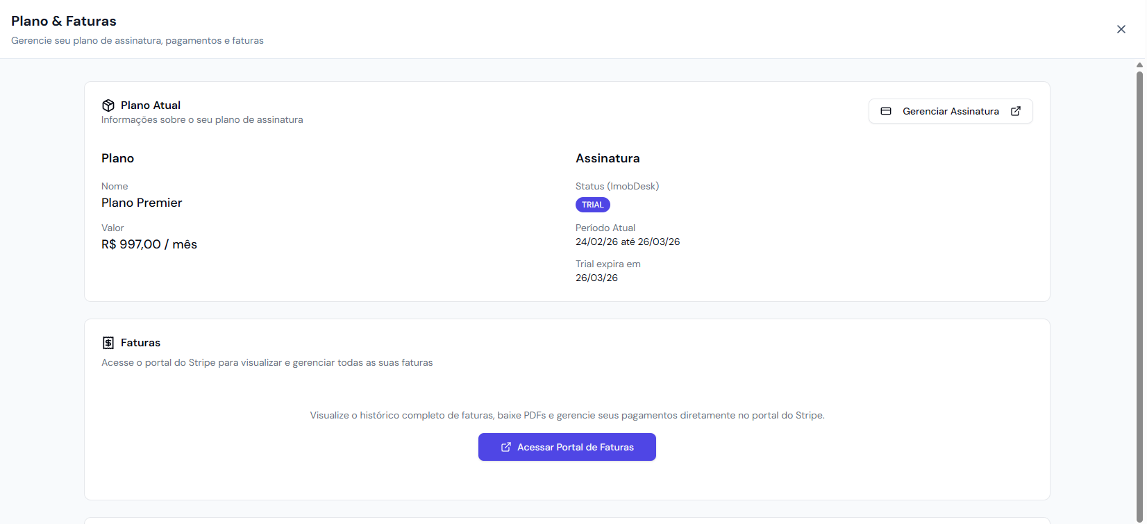 É possível verificar suas faturas e atualizar sua assinatura.