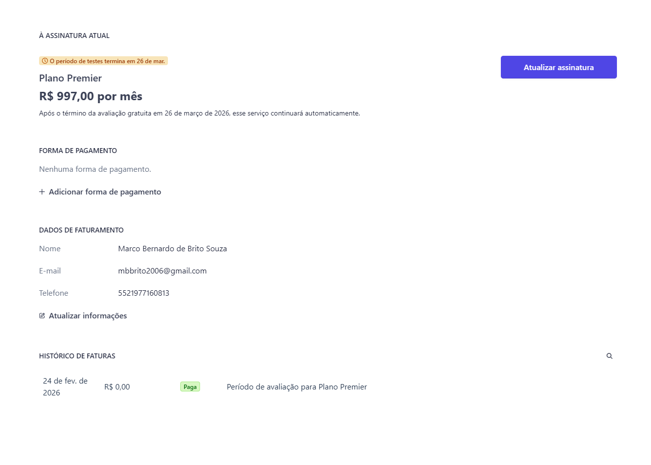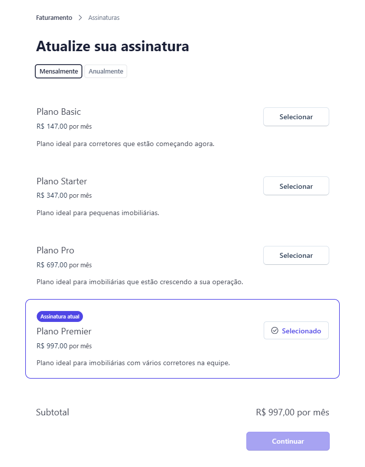 Para atualizar ou trocar o plano atual, basta clicar em Atualizar assinatura.