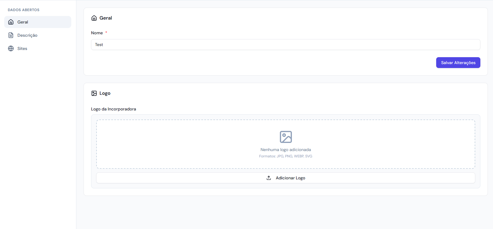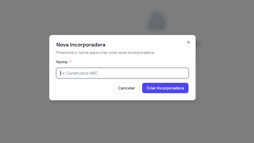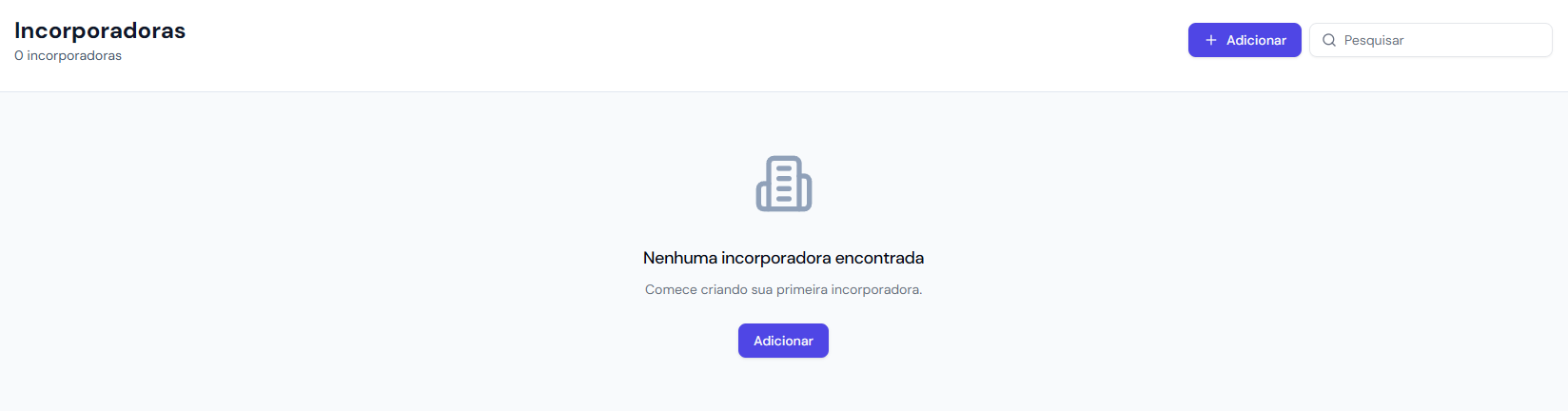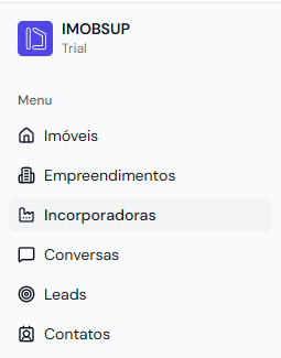 Para adicionar uma incorporadora ao dashboard, basta clicar na aba Incorporadoras no menu lateral.