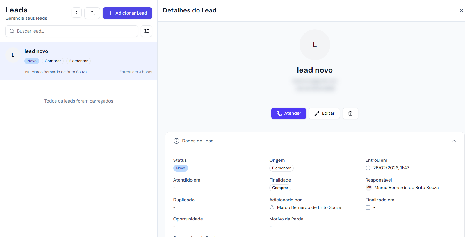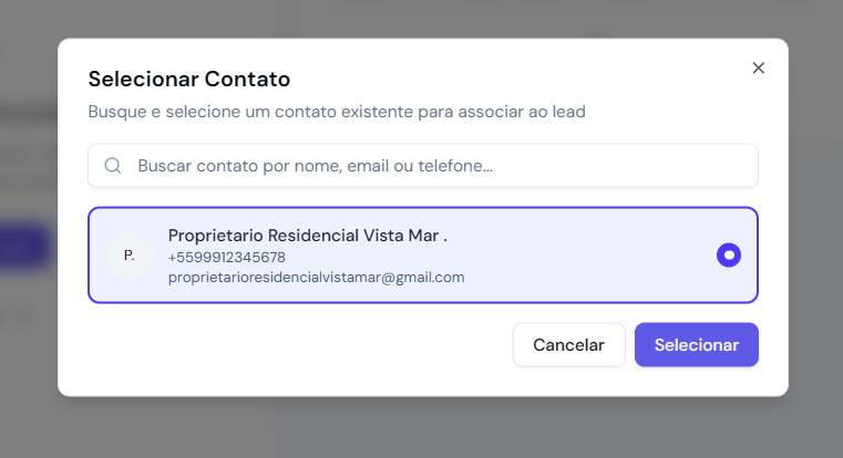Clique em Adicionar Lead, é possível adicionar um contato existente ou criar um novo contato