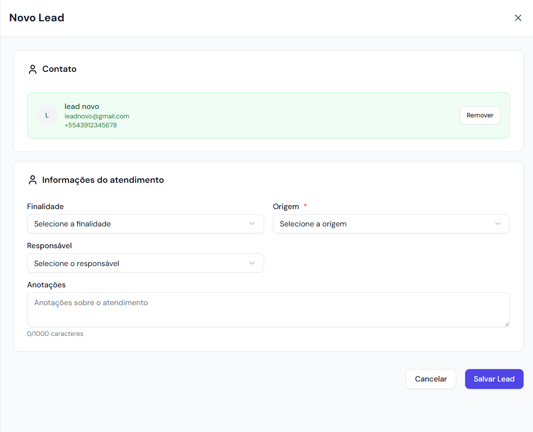 Após selecionar o contato, é possível registrar as informações e dados do lead, incluindo Finalidade (compra, aluguel ou temporada), Origem (Presencial, Indicação, Facebook) e o usuário responsável pelo Lead