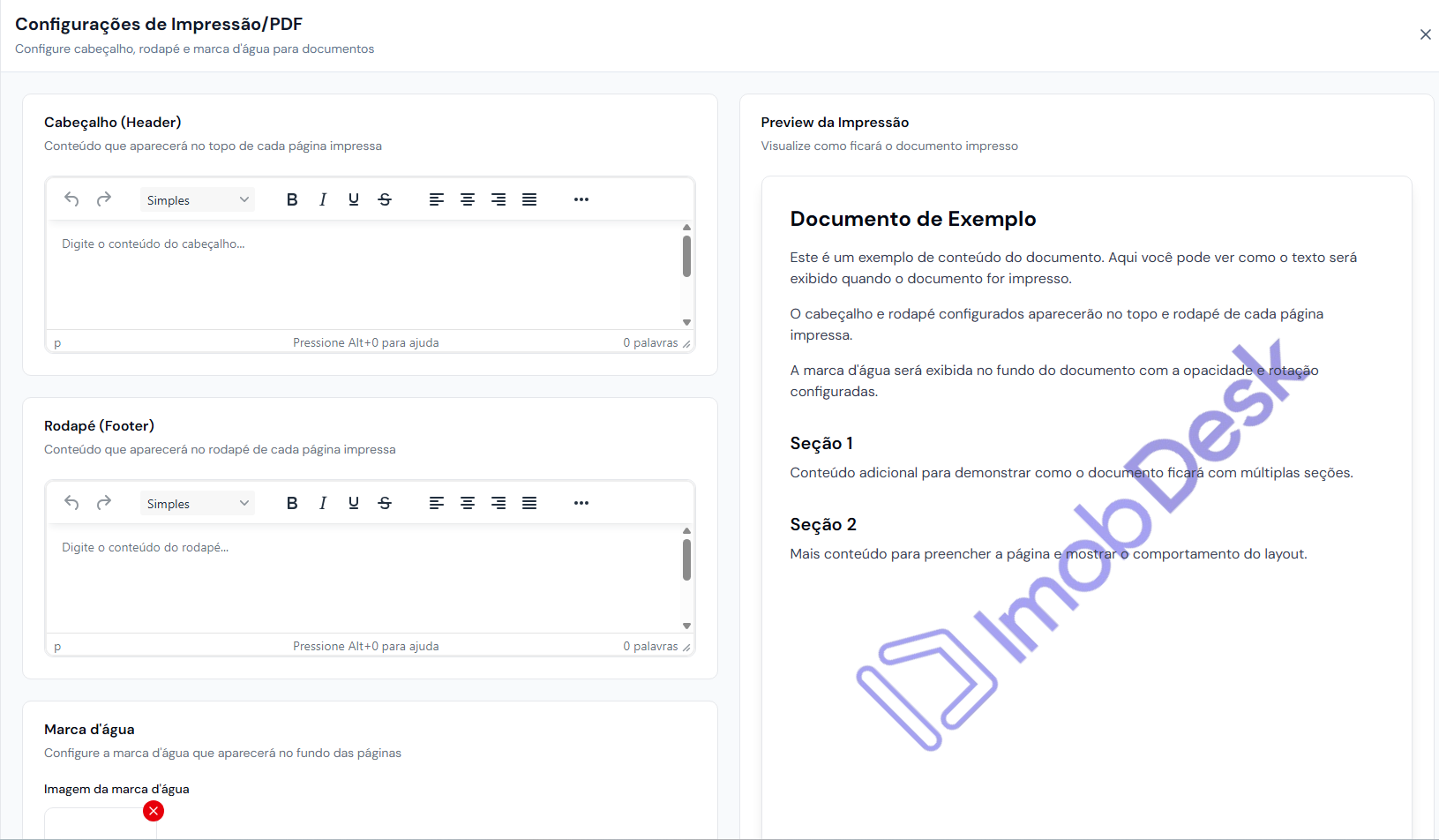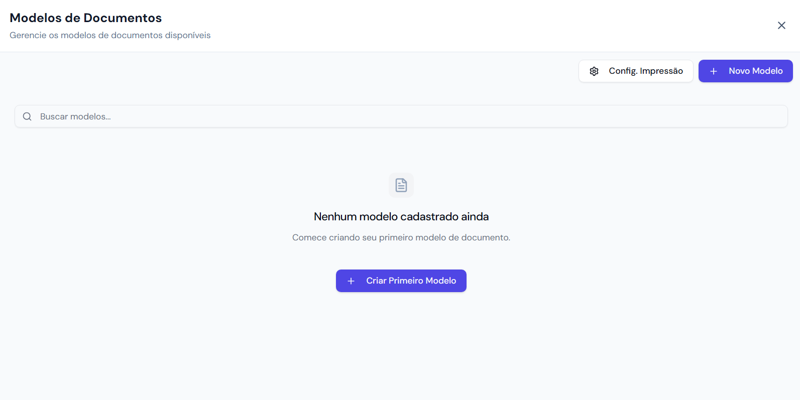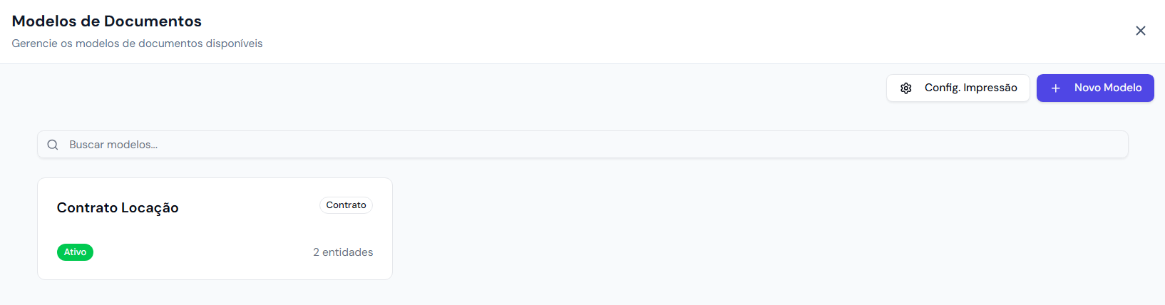 Também é possível configurar a Impressão do Modelo de Contrato, basta clicar em Config. Impressão ao lado de Novo Modelo ainda no menu de Modelos de Documentos