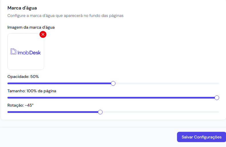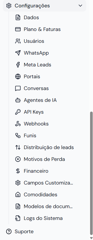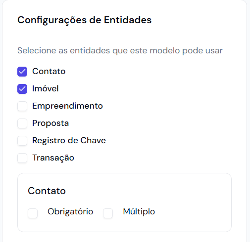 À direita, você verá a seção Configurações de Entidades. Marque quais entidades serão usadas neste modelo (Contato, Imóvel, Empreendimento, Proposta, Registro de Chave e Transação)