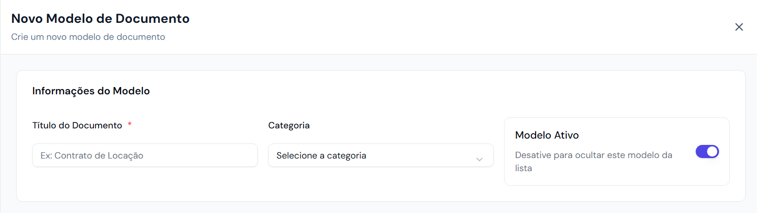 Preencha as informações básicas do modelo (Título do documento, Categoria e Status do Modelo)