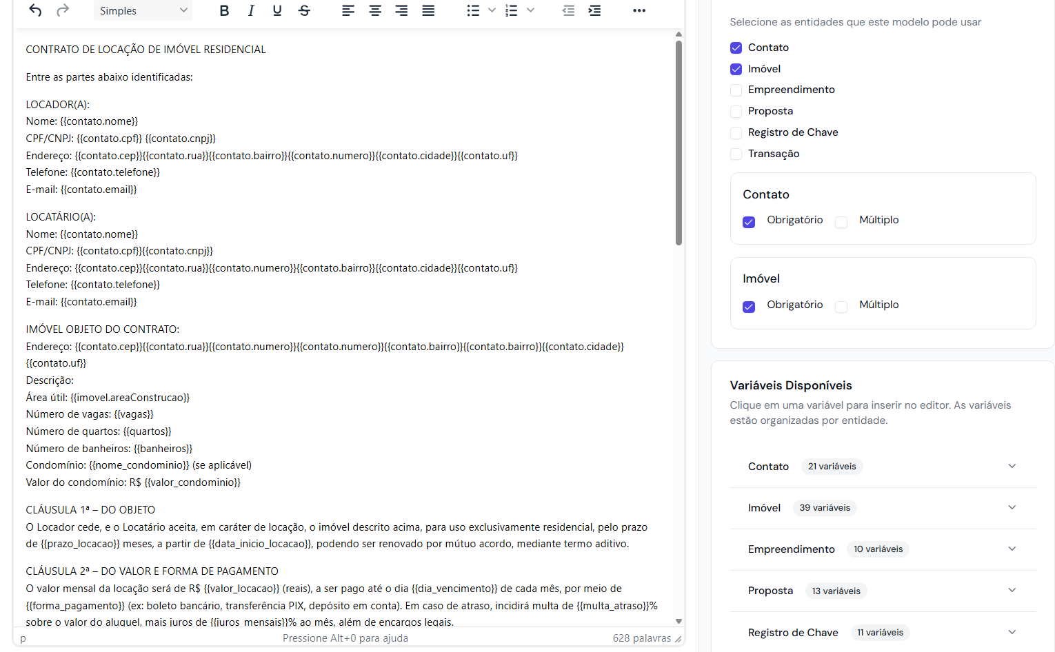 No editor de texto central, digite o conteúdo do seu documento, clique em qualquer item na seção Variáveis Disponíveis à direita elas serão inseridas automaticamente no editor