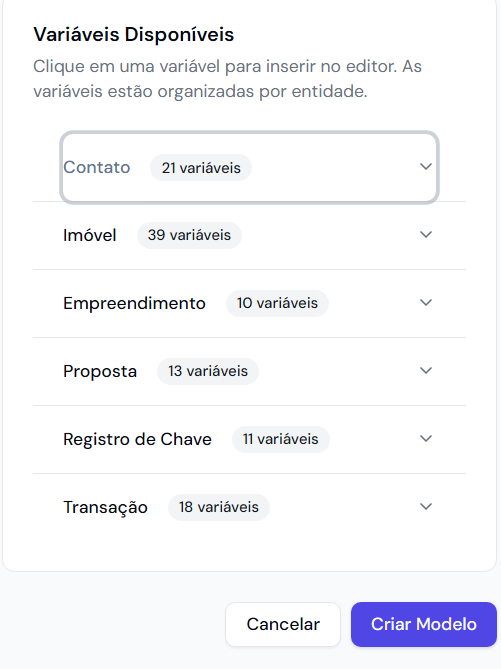 Essas entidades definem quais variáveis dinâmicas estarão disponíveis para inserção no texto, exemplo: se marcar Contato, poderá usar variáveis como, Nome do contato{{contato.nome}}, Telefone do contato{{contato.telefone}}ou Email do contato{{contato.email}}