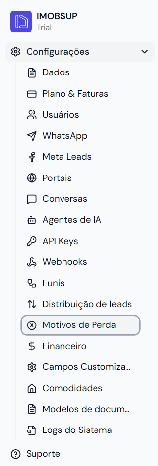 Em configurações, na aba lateral procure por Motivos de Perdas
