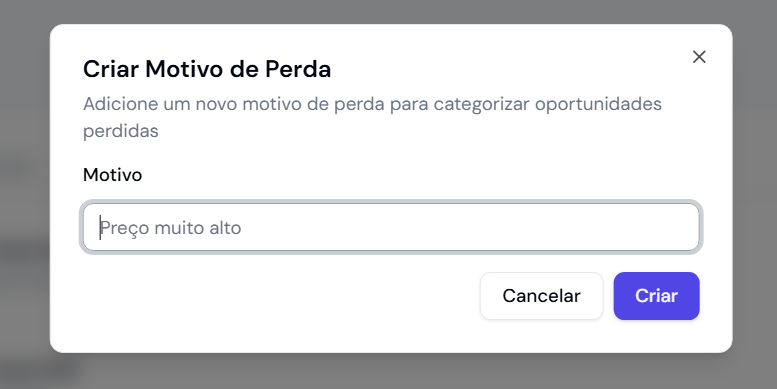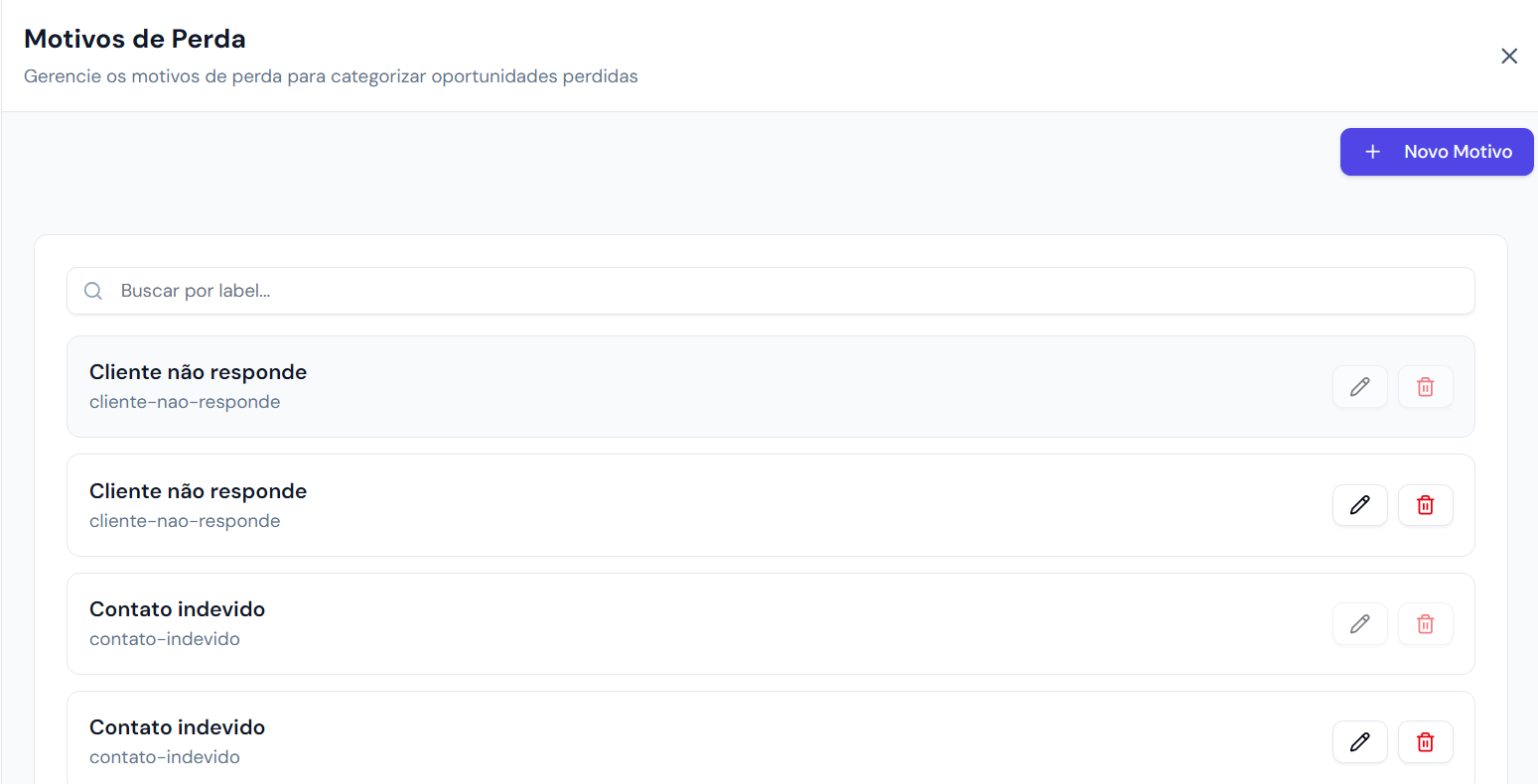Nesta janela, é possível criar e configurar diversos motivos de perda para controle de Leads, para criar um, basta clicar em Novo Motivo