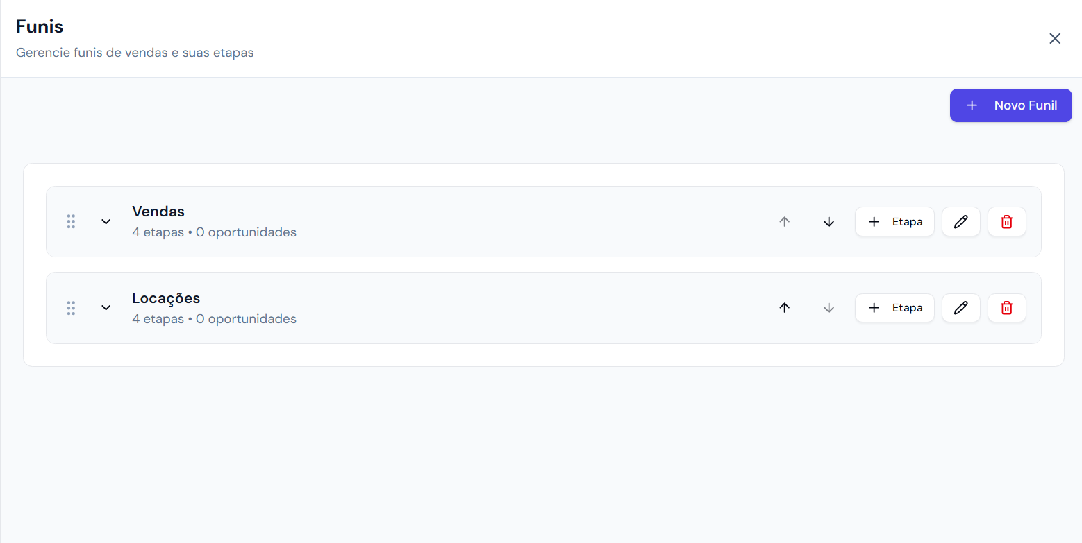 Os Funis de Vendas no ImobDesk são ferramentas de gestão que permitem organizar e acompanhar o progresso das oportunidades de negócio em etapas definidas, desde o primeiro contato até o fechamento da venda ou locação.