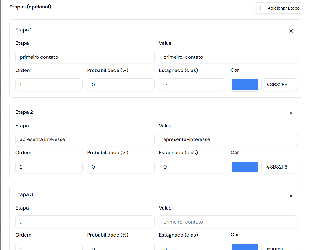 Clique em + Adicionar Etapa para adicionar as fases do processo