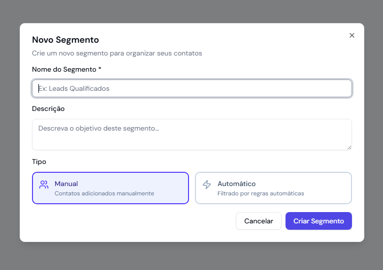 Preencha os dados básicos e o tipo do Segmento